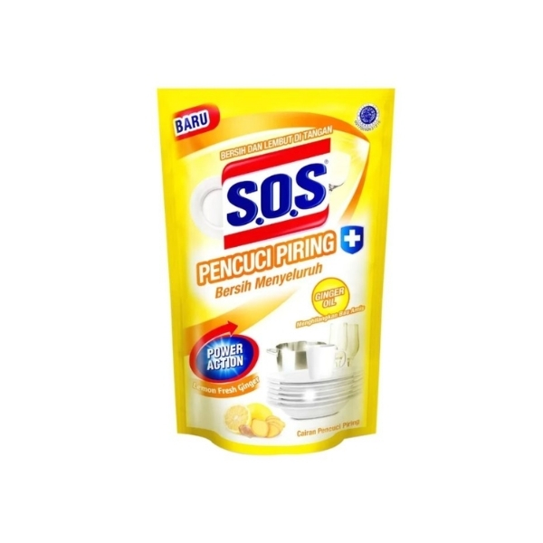 SOS Dishwash Lemon Fresh merupakan sabun cuci piring dengan aroma lemon segar, efektif membersihkan sisa makanan dan lemak tanpa merusak tangan.